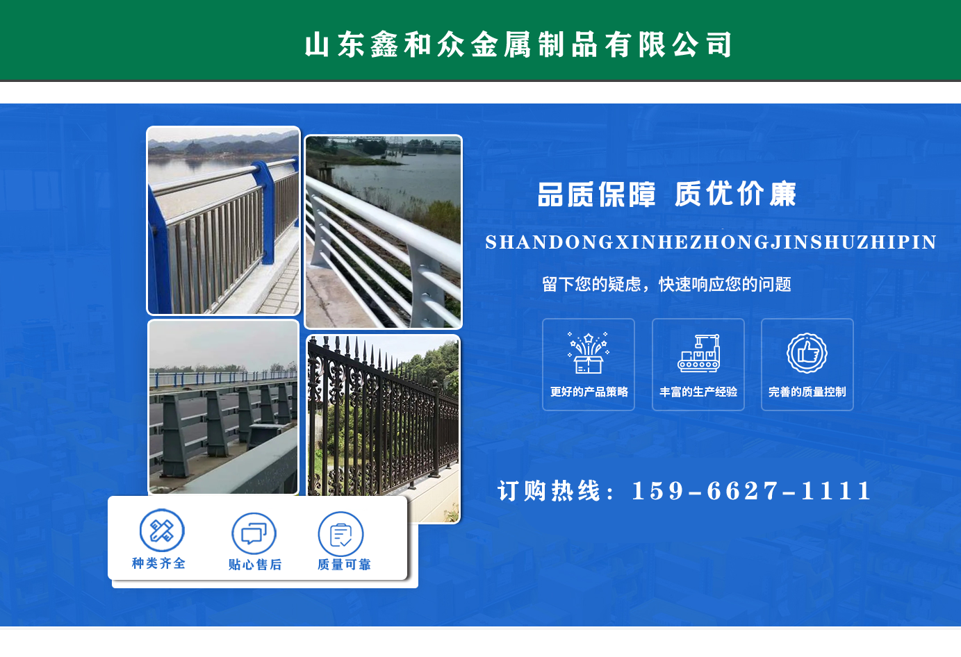 山東鑫和眾金屬制品有限公司主要產(chǎn)品有防撞護(hù)欄,橋梁護(hù)欄,道路護(hù)欄,河道護(hù)欄,不銹鋼護(hù)欄等護(hù)欄。提供設(shè)計方案,一站式定制,包您滿意價格優(yōu)惠,歡迎來電咨詢!    公司常年從事銷售護(hù)欄防撞護(hù)欄,橋梁護(hù)欄,道路護(hù)欄,河道護(hù)欄,不銹鋼護(hù)欄,橋梁鋼護(hù)欄,河道燈光護(hù)欄等。產(chǎn)品廣泛應(yīng)用于橋梁、河道、旅游景區(qū)、道路、公路、公園、小區(qū)、景觀、道路防撞等領(lǐng)域?!   」井a(chǎn)品均采用優(yōu)質(zhì)不銹鋼材料,符合相關(guān)標(biāo)準(zhǔn)。各種型號不銹鋼復(fù)合管及護(hù)欄,質(zhì)量嚴(yán)格把控。產(chǎn)品強(qiáng)度高、耐腐蝕、焊接牢固、抗沖擊、性能好,防撞護(hù)欄結(jié)構(gòu)簡單、美觀實用大方。     歡迎前來訂購!...